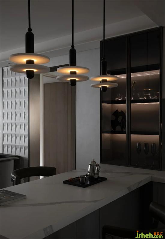 開放式的空間布局,將廚房徹底敞開,賦予其社交屬性,吧臺與餐桌合二為一,選用與電視背景墻同色系的巖板,圓潤的餐椅形制、造型獨(dú)特的吊燈及透明酒柜內(nèi)部隱藏的燈光,將用餐的氣氛渲染得十分溫馨。停下慌忙的腳步,可探索一番美食于生活的意義。