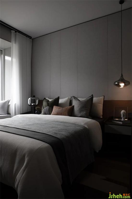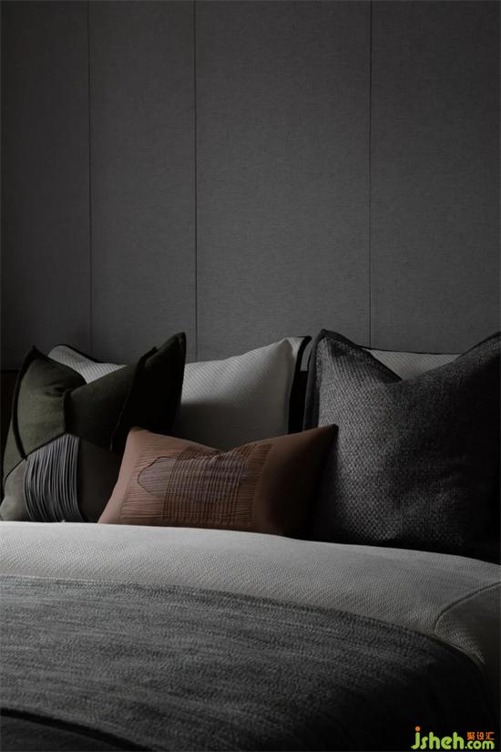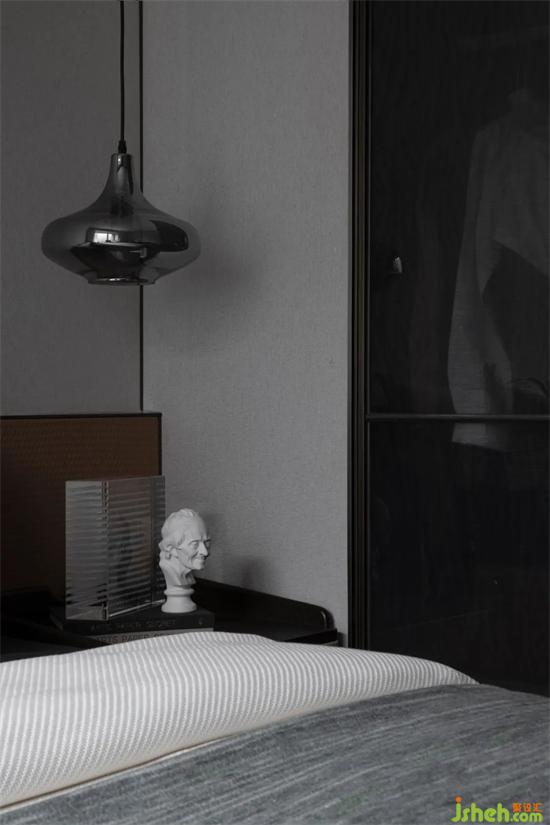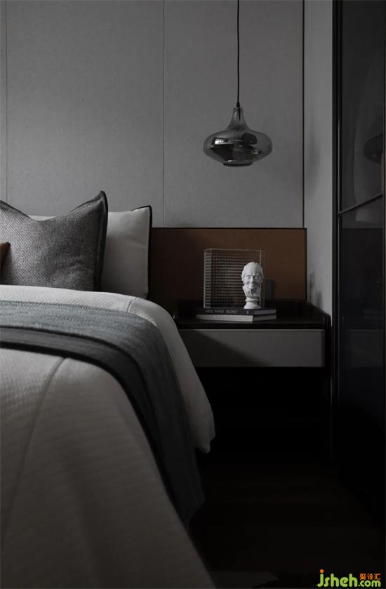 主臥以淺灰和白色為主,床頭下方橙色皮革的加入,消除了單一色系帶來的沉悶感,再搭配上精致的燈飾和雕塑擺件,中洲青島半島城邦樣板房設(shè)計(jì)瞬間提升了整個(gè)臥室的藝術(shù)調(diào)性,無形中也顯露出主人家獨(dú)特的品味和氣度。
