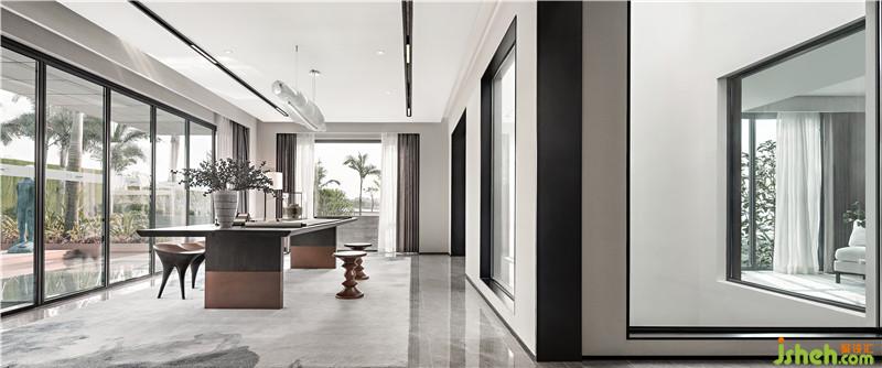 這是一個(gè)充滿流動(dòng)陽(yáng)光的藝術(shù)空間。通過(guò)水汀石階步入整座建筑,分隔內(nèi)外的不是厚重的墻壁而是橫貫書畫廳的玻璃幕,能夠?qū)⒆貦皹涞木G色和??诘娜粘鋈章溆橙霃d內(nèi)。