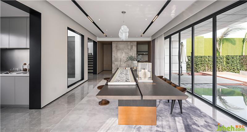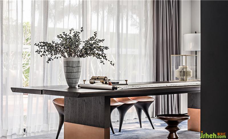 除了渾然一體的書畫長(zhǎng)案和宛如雕塑般的木椅,沒(méi)有一分過(guò)度的布置,配以簡(jiǎn)約明快的空間線條和大理石材質(zhì)的素雅本色,“天然去雕飾”的設(shè)計(jì)理念讓建筑內(nèi)外的界線變得模糊,但又為身處其中的藝術(shù)家提供了思考創(chuàng)作所必須的靜謐。