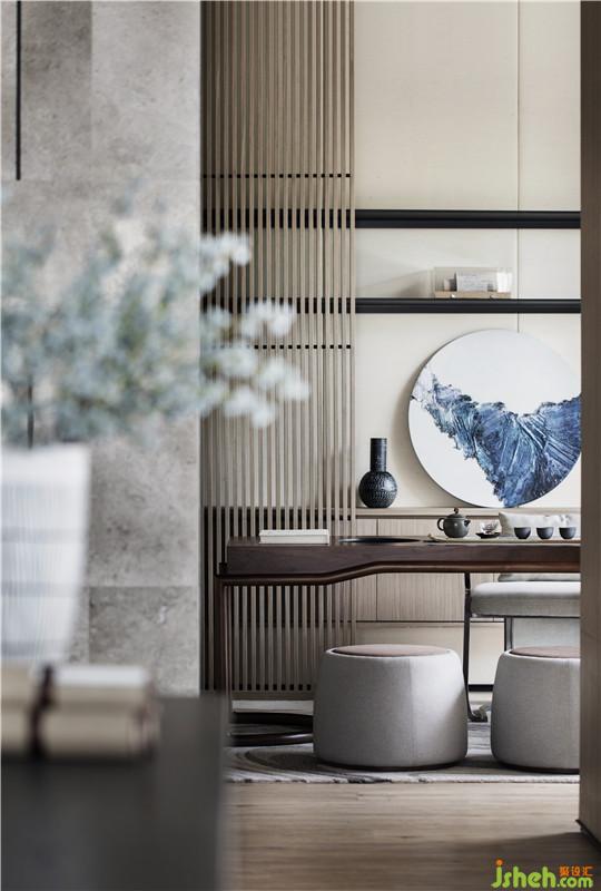 茶室與書畫廳構成了相互貫通的空間格局,闡述了“茶通六藝”的中式哲學。通過石與木的相互銜接,仿佛將空間也進行了理性和感性的切割。室內的中式家具與窗外的草色春光阻隔了外界的塵囂,在此靜心品茗一盞,給心靈以慰藉。