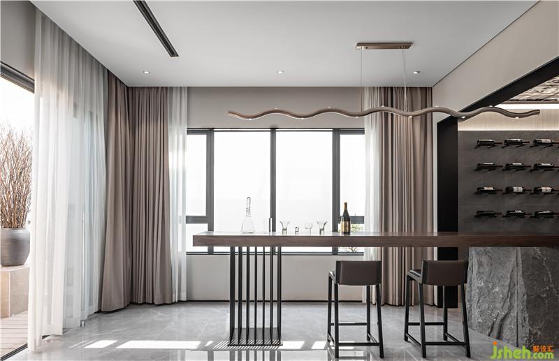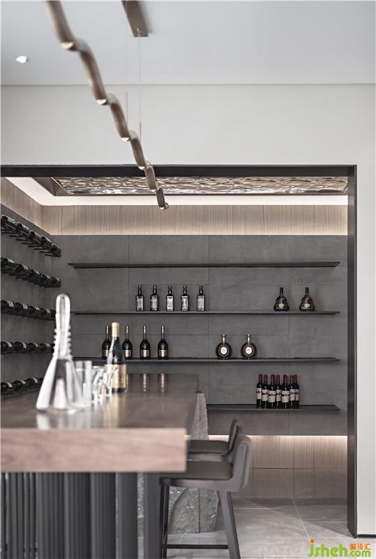酒架與吧臺的貫通式設(shè)計,黑色隔板與黑色墻壁搭配出吧臺的展架形體,一瓶瓶美酒依次放置,產(chǎn)生重復(fù)的序列美感,讓人產(chǎn)生想要享受美酒佳肴的沖動。