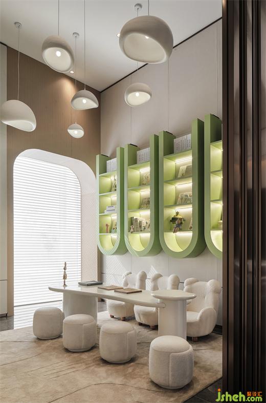 書吧區(qū)中,MDG融合邳州歷史典故以及項目LOGO提煉創(chuàng)造出IP設計“騎燕精靈”,精靈與燕子組合展現(xiàn)的靈巧的飛行姿態(tài)傳遞出這座城市的勤勞,勇敢和進取的古城精神,售樓處設計共同營造出充滿希望與朝氣的書吧場景。