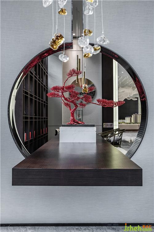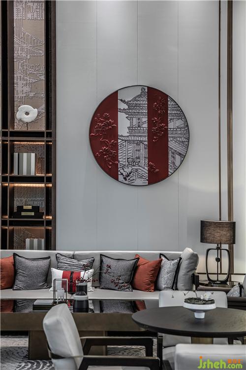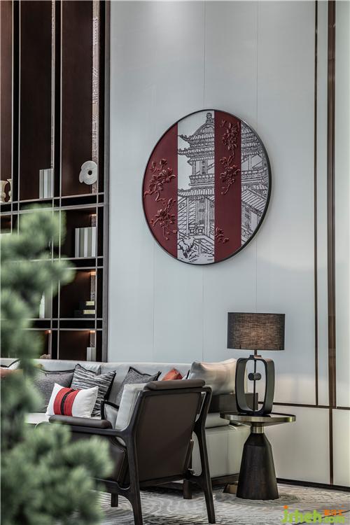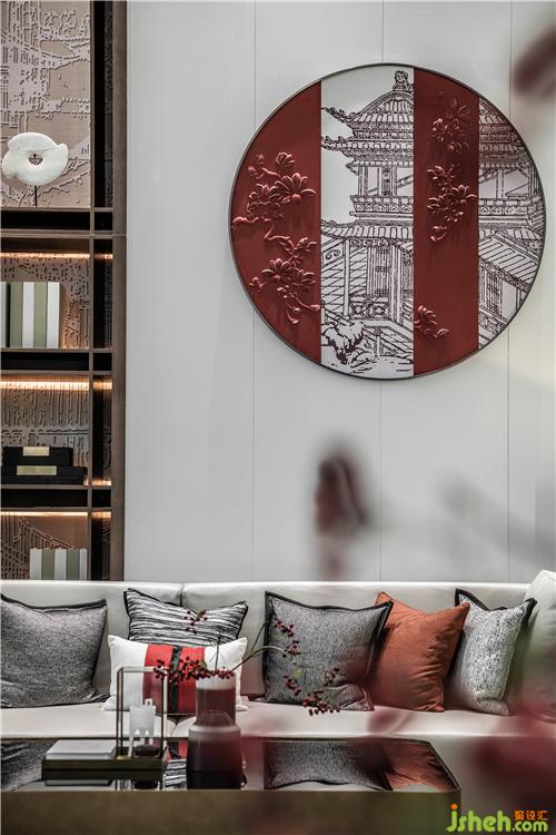 以黑白灰為空間主色調(diào),東方紅為點(diǎn)綴色,運(yùn)用現(xiàn)代設(shè)計(jì)手法使空間展示新中式空間的東方之美。具有東方古樸的圓形掛飾,畫面簡(jiǎn)單卻有著讓人無(wú)法抗拒的意境之美。