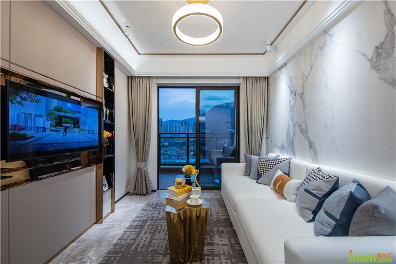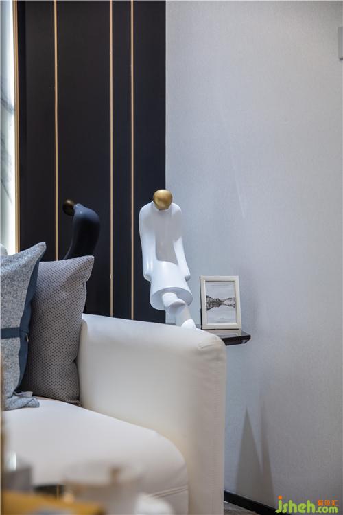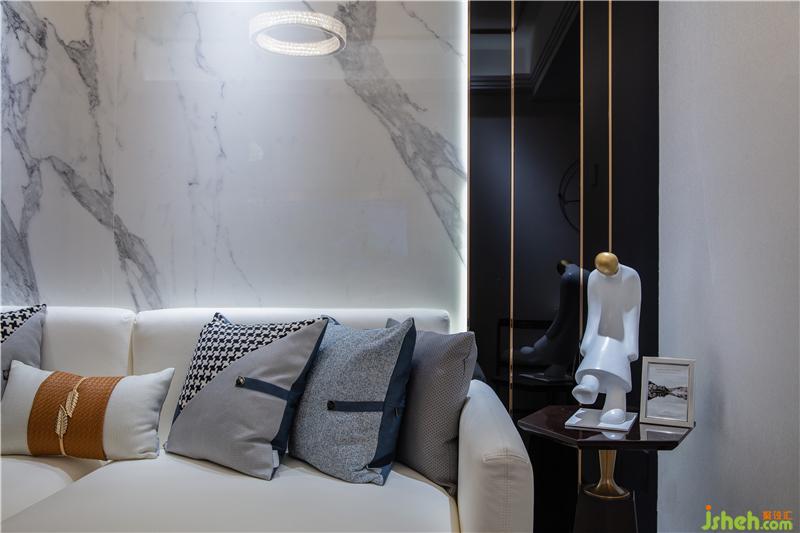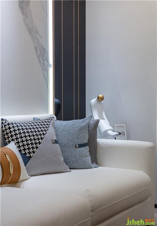 客廳整體空間現(xiàn)代簡(jiǎn)約,雪花白巖板、米黃色硬包和灰色地磚相搭配,空間色調(diào)于明暗變化間無形為空間帶來放大的效果。樣板房設(shè)計(jì)由上至下,現(xiàn)代感氣息之余更具濃郁家居生活氛圍。