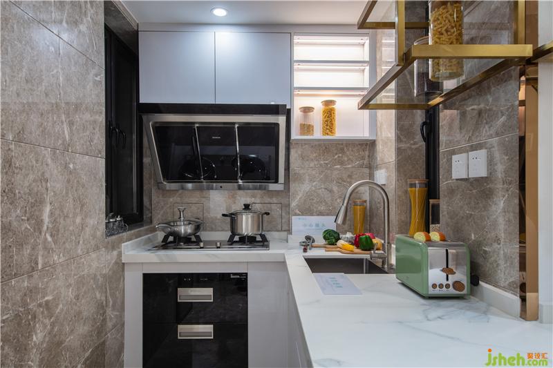 眼光流轉(zhuǎn),實(shí)用的開放式廚房映入眼簾,白色的大理石臺(tái)面、黑色的電器與金屬色的吊柜相互融合,與空間碰撞出簡(jiǎn)約時(shí)尚的別樣體驗(yàn)。
