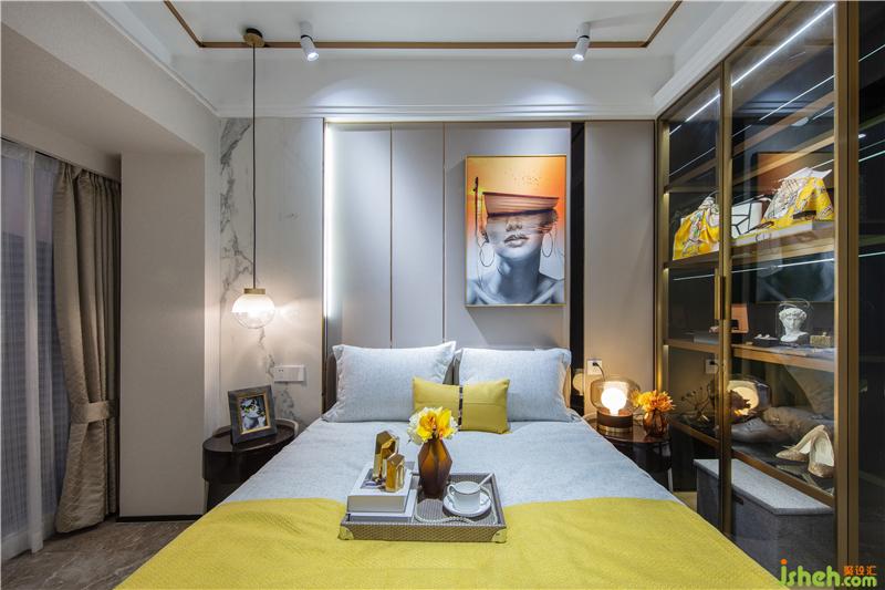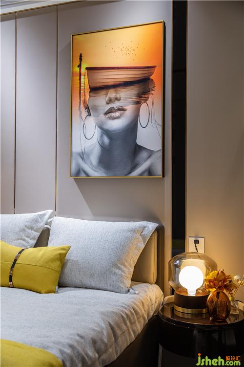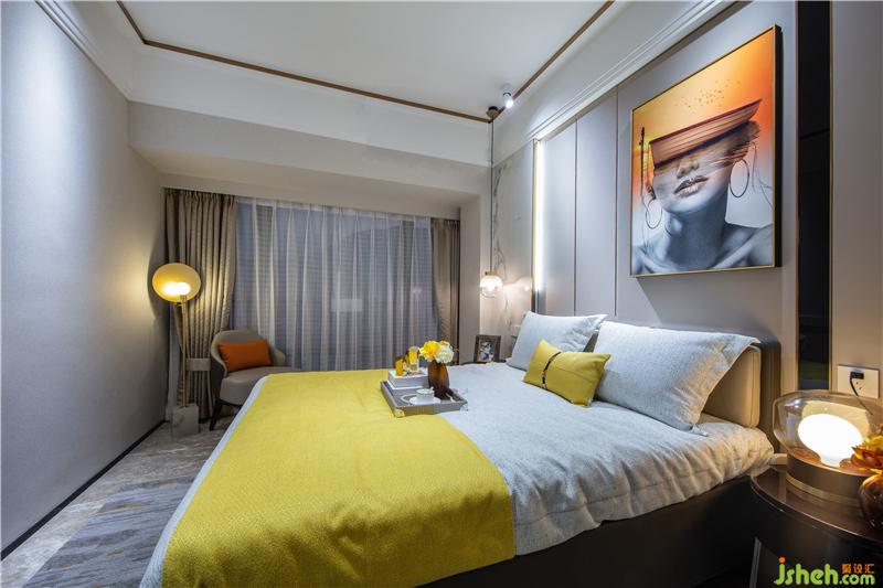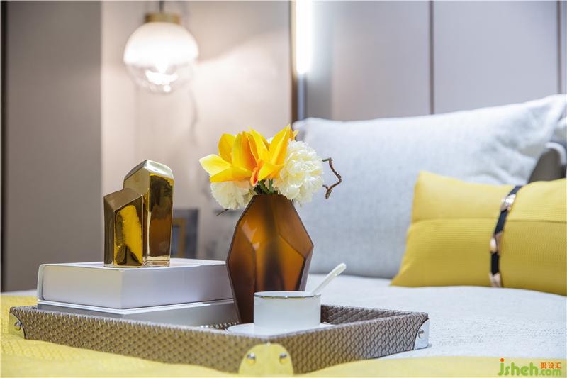 臥室的樣板房設(shè)計(jì),延續(xù)了整個(gè)戶型明亮柔和的色調(diào),溫暖俏皮的檸檬黃點(diǎn)綴其中,如冬日暖陽又似暗夜星光,無聲傳遞默默溫情。
