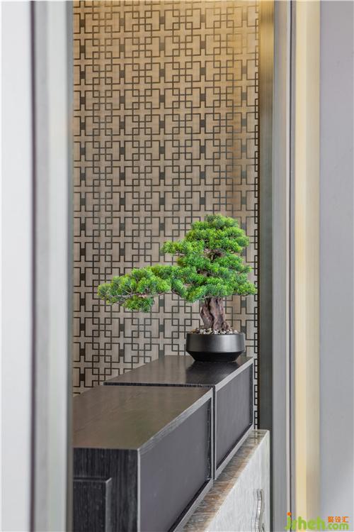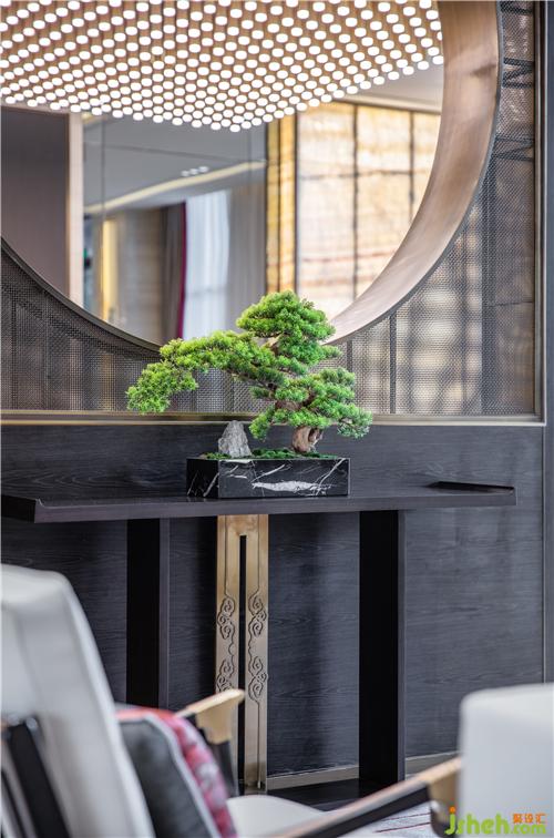 圓形門洞,框出幽遠(yuǎn)寧靜的畫面,引人入勝,吧臺上擺放著寓意迎客松盆景,售樓處設(shè)計傳達(dá)空間屬性,歡迎賓客前來參觀。