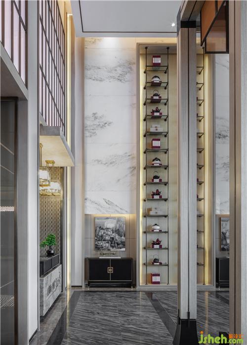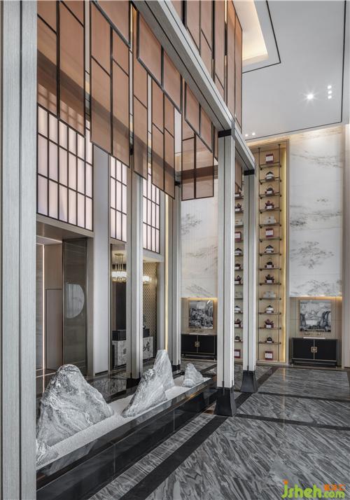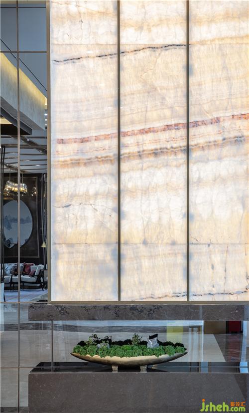 Above the sand table exhibition area, the installation lamps made of metal texture material pour down like a waterfall, full of ritual. The light box made of ink and jade marble, the details of which are integrated with modern design elements, "integrated" the Oriental implicit beauty.