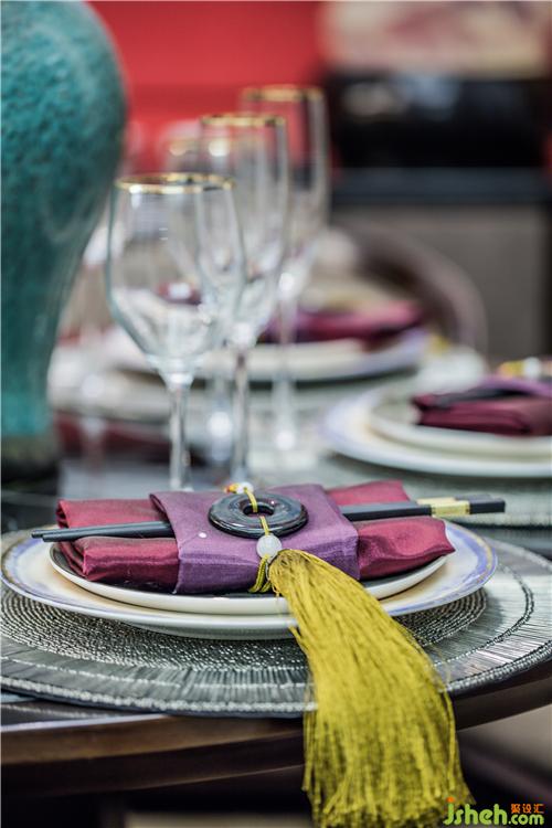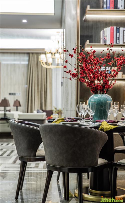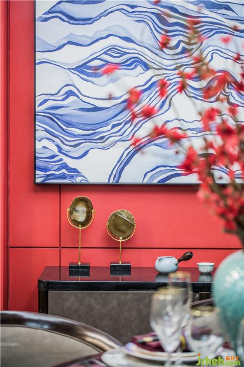一隅的餐廳布局簡約,格調高雅。一幅縹緲的寶藍水墨畫,樣板房設計與紛繁的梅花藝品和仿古銅鏡互融交錯,加上印記灰大理石和軟包等現代材質的注入,流暢地表達出傳統(tǒng)韻味,亦將現代審美展露無遺。