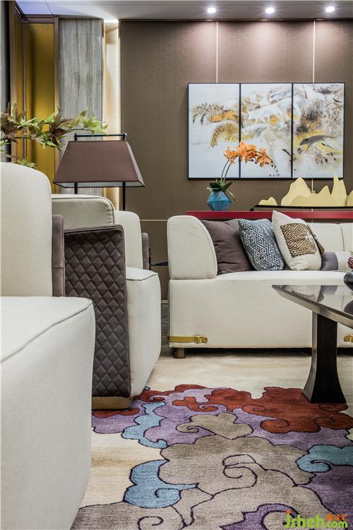 走入客廳,瑞吉木紋大理石作底,加以胡桃木飾面,輔以靈動的彩墨畫,綴以錯落有致的藝術品,襯以卡其色打底的祥云地毯,樣板房設計渲染出“山氣日夕佳,飛鳥相與還”的詩情畫意。