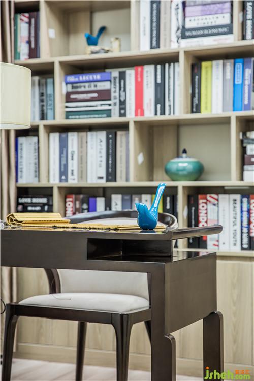 書房延續(xù)了客廳的詩意飾品,深色書桌上精巧燈具的擺放,琳瑯滿目的書柜中予以文雅風韻的瓷器品點綴,散發(fā)出亦古亦今的層次之美。