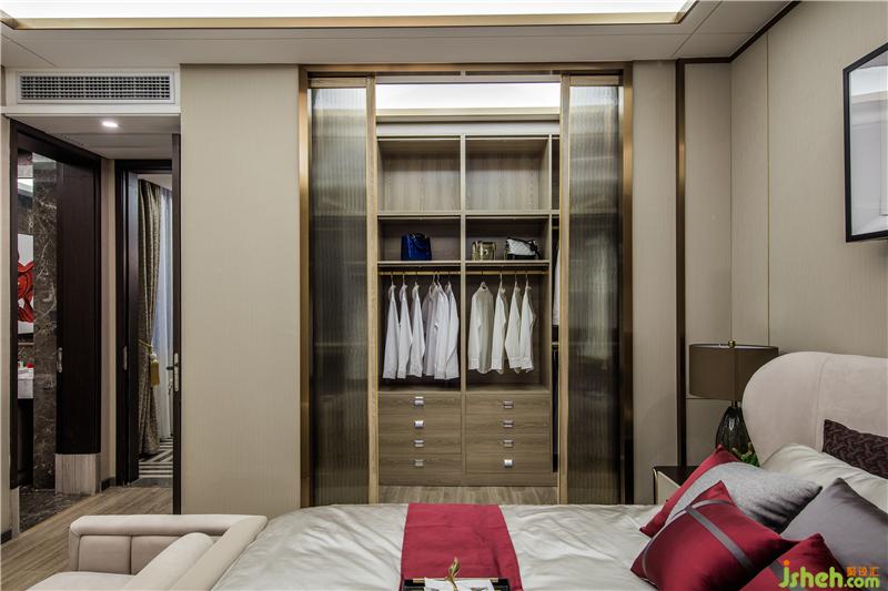 移步主臥,米白色床品與古典紅抱枕,呈現雅致柔和之感,木制衣柜間配以玫瑰金線條,樣板房設計體現空間的簡約和低奢。水墨渲染的地毯,與床頭上方的寫意山峰婉轉呼應,盡顯詩畫美感,提升了居住環(huán)境的品味。
