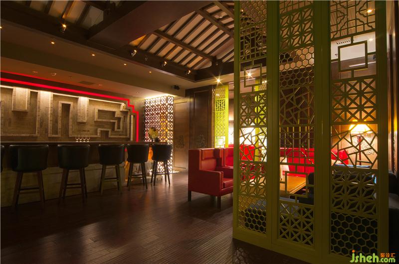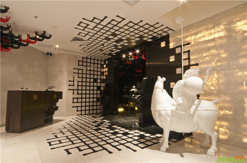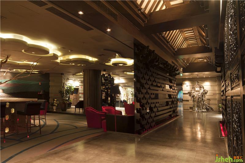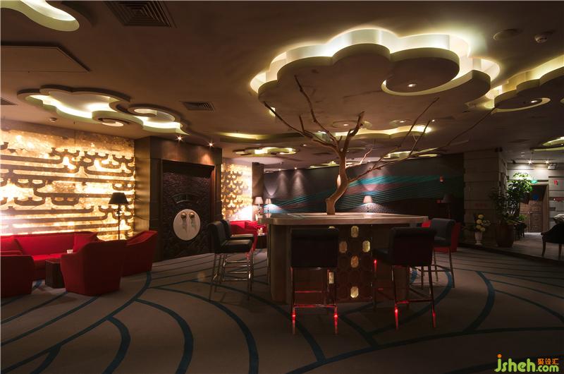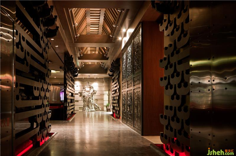 項目的設計由不同的主題部分構(gòu)成,巧妙地把中國嶺南文化和西方現(xiàn)代設計手法,古典與現(xiàn)代的文化元素糅合在一起,賦予了空間一種脫俗的大氣與優(yōu)雅。項目的門廳主要以斗拱作為裝飾。從正門口望進場內(nèi),墻體與地面的圖案巧妙地形成一個圓形,吸引著客人去一探究竟。過了門廳便是大廳。大廳由越王包廂,威士忌吧,紅酒吧,雪茄吧等部分組成,每個部分的設計靈感都來源于不同的主題。
