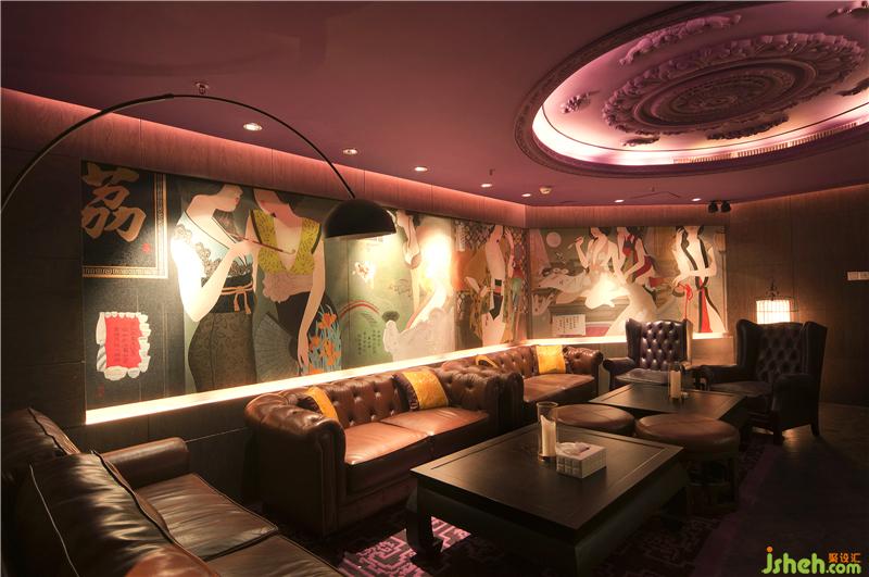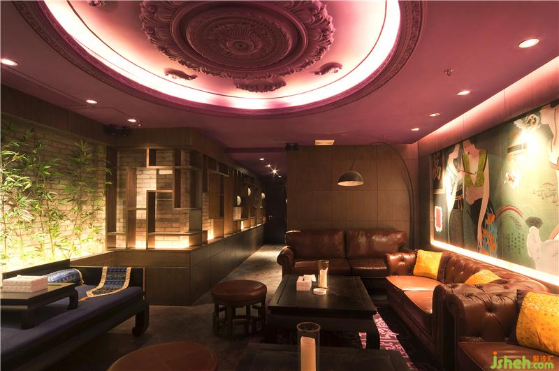 天花下方一圈以假書做裝飾也有其喻意——設(shè)計師有意選擇了深色的老式英文書,書側(cè)面的金色條紋圖案看上去就像雪茄上的標簽環(huán),這樣從側(cè)面看上去就像是一支支長短不一的雪茄排列成一圈,重溫了舊時歐洲圖書的古老情調(diào)。四季包廂是一個以女性為主題的空間。包廂以墻上名為“四季”的油畫命名。這些油畫以新穎的現(xiàn)代手法,通過展示女人不同的體態(tài)表現(xiàn)女人的嫵媚多姿,就像四季一樣變幻無窮,給人以想象。房間以紫色為主色調(diào),襯托出神秘,高貴,精致的情調(diào)。天花頂棚的圓形大浮雕是歐洲新古典主義時期延續(xù)下來的房間里的綠色植物又為空間增添了一絲小清新,配合仿古的家具擺設(shè),集大成地把古典,現(xiàn)代,女性美,和自然等不同元素糅合在一起,創(chuàng)造出一個唯美的空間氛圍。