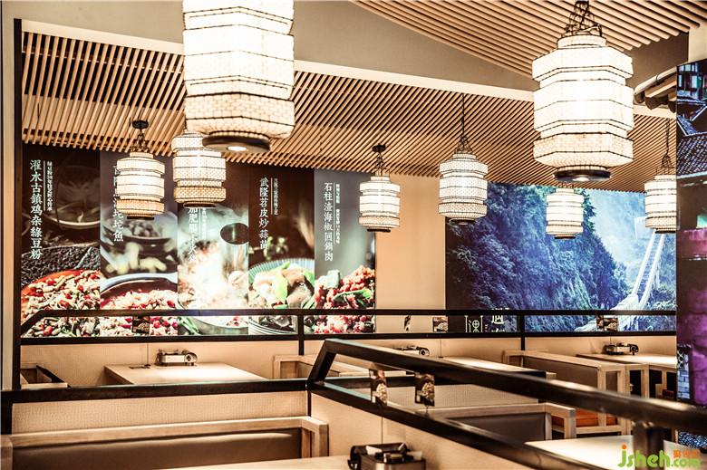 餐廳設(shè)計(jì)以一排12米長的連廊及9米長的明檔為主景的B區(qū),將遇東嵐的菜名羅列在明檔之上,以原木色實(shí)木為基礎(chǔ),連綿起伏的立體造型尤為顯眼。連廊配上小青瓦,更凸顯 出少數(shù)民族地區(qū)特有的文化建筑。
