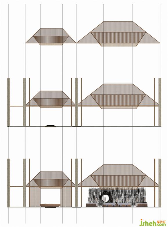 為了尋求“山水聚合、藏風(fēng)得水”的傳統(tǒng)建筑理念,空間中被并列地置入大型的木質(zhì)構(gòu)架作為整體建構(gòu)和分割空間的主體骨骼造型,形成“舍”的框架結(jié)構(gòu)部分。