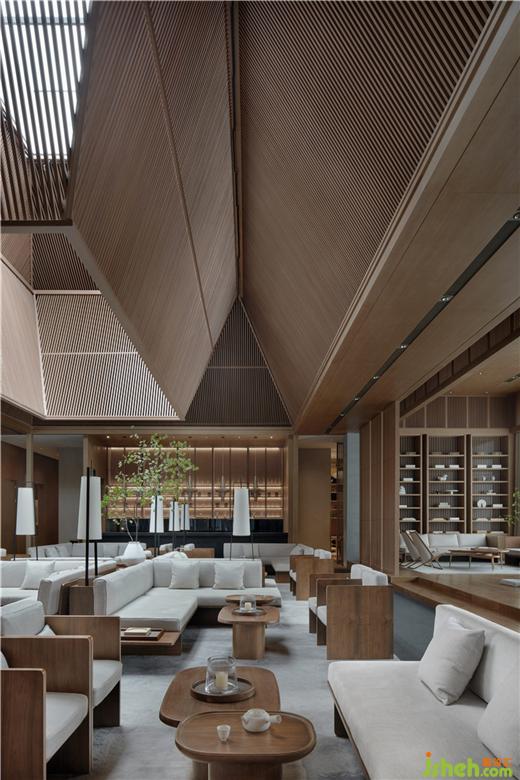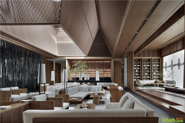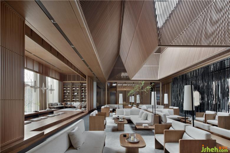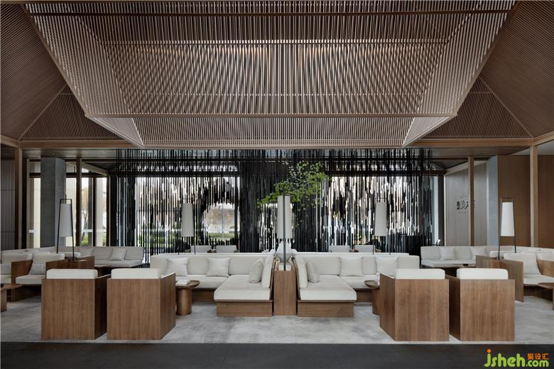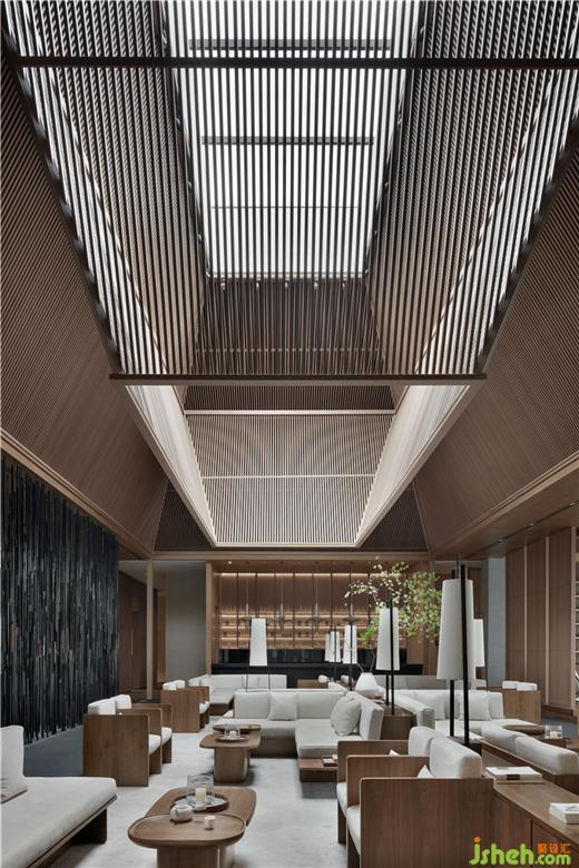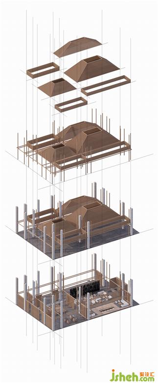 構(gòu)架的頂部吸收并運(yùn)用了中國古典殿閣與井亭的“盝頂”建筑造型樣式,形成四角上揚(yáng)收合的形態(tài),凸顯出生命氣息與能量聚合的理念,同時在聚合的頂部留出可呼吸的天窗氣口,充分地吸納天地靈氣和流轉(zhuǎn)的太陽光線。從而形成“舍”的傾斜式頂部結(jié)構(gòu)部分?!氨J頂”的運(yùn)用,產(chǎn)生出高低起伏、聚合離散的空間節(jié)奏,也營造出林泉丘壑、山野幽僻的悠遠(yuǎn)意境。