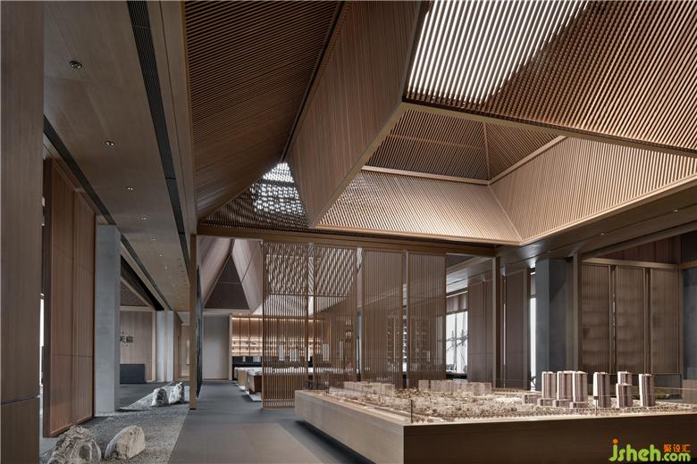 另外,針對主體沙盤區(qū)和深度洽談區(qū)等主要的空間場域,上挑的頂部能量再次被聚合起來,以同樣聚合的造型再次向下方的功能承接區(qū)域傳遞能量,同時起到過濾上部光線及凝聚并傳導(dǎo)能量和氣息的功能。