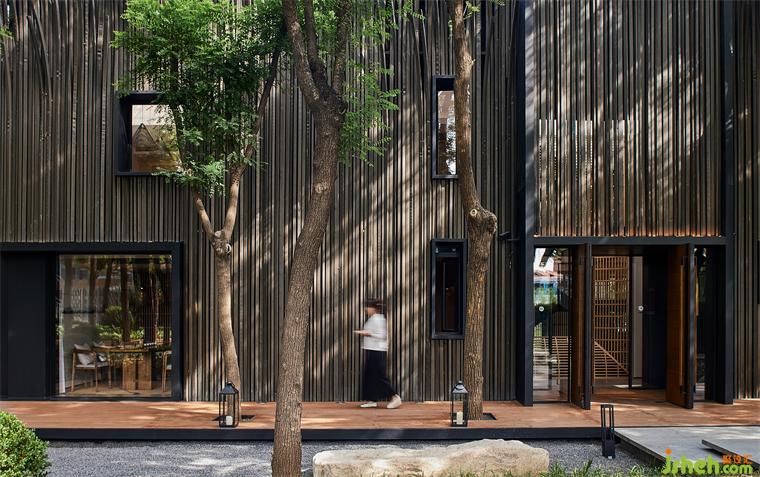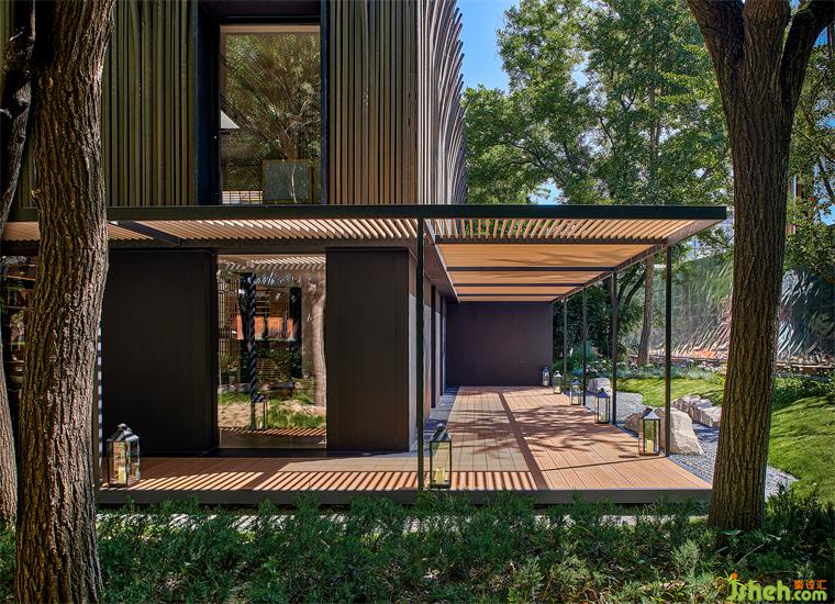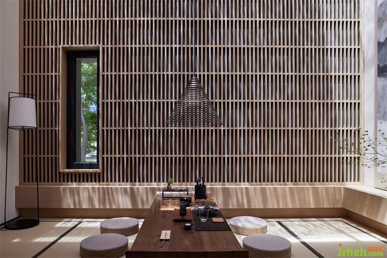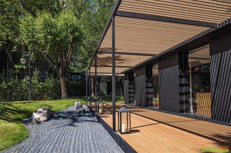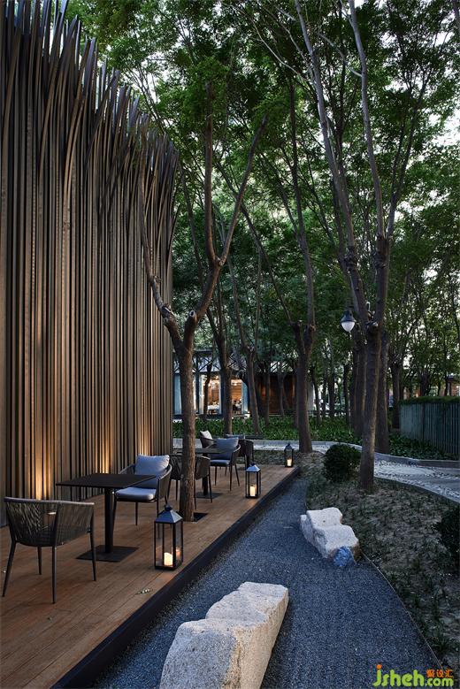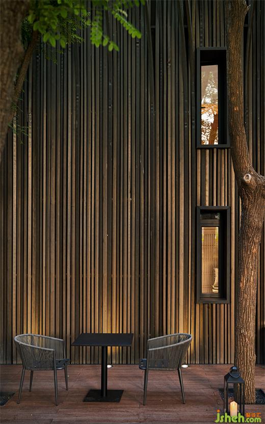 由于原建筑與室外環(huán)境直接相連,又因地勢(shì)陷落而困頓突兀,茶空間設(shè)計(jì)以建筑為核心,將周圍景觀向外推離4米,并向下挖掘與建筑齊平,形成一條在外部環(huán)繞的過(guò)渡帶,將公共區(qū)域與主建筑柔軟相隔。建筑則向外延伸出2米地臺(tái),對(duì)應(yīng)立面條形窗圍合木格柵連廊,茶座散落。