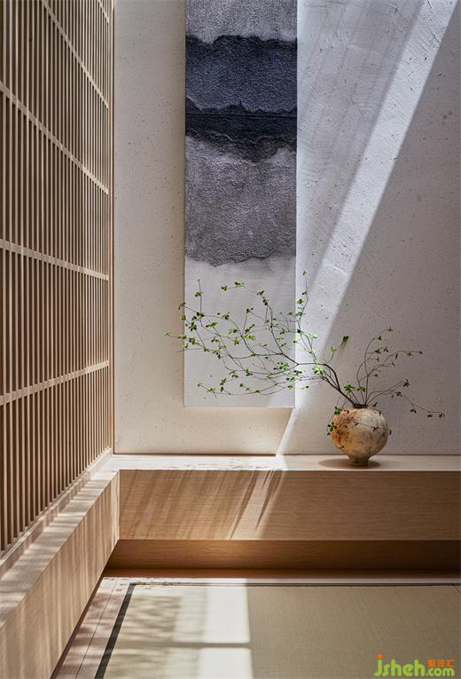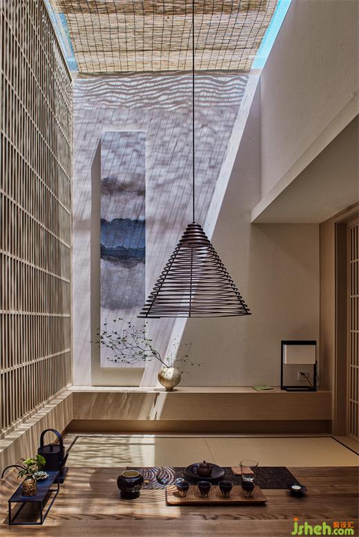 同時(shí),環(huán)繞建筑立面打開(kāi)5扇縱向條窗,框起室外景致做畫軸上墻。茶空間設(shè)計(jì)無(wú)論在室內(nèi)任何角落,自然之光都生機(jī)涌動(dòng),它成為空間的基石與精神的寄望,將建筑、人與天地緊緊相連。