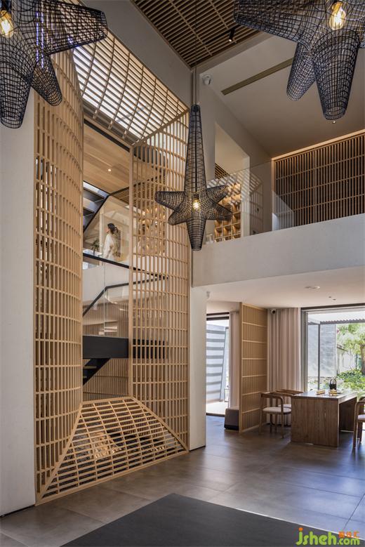 為迎“山光滿幾”,設(shè)計(jì)師將建筑體中央屋面打開(kāi),鑿空昔日的昏暗盒子,插入垂直核心筒,容納扶梯。