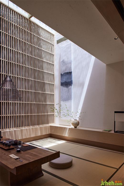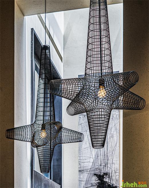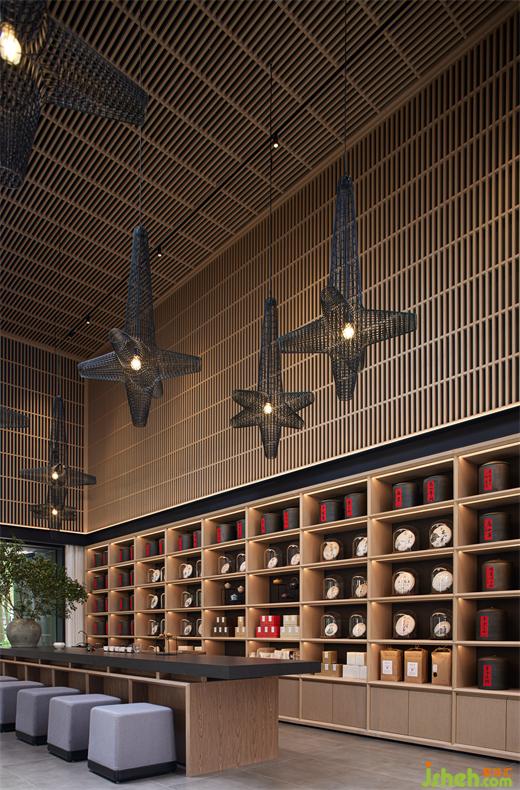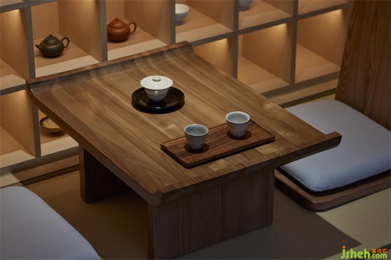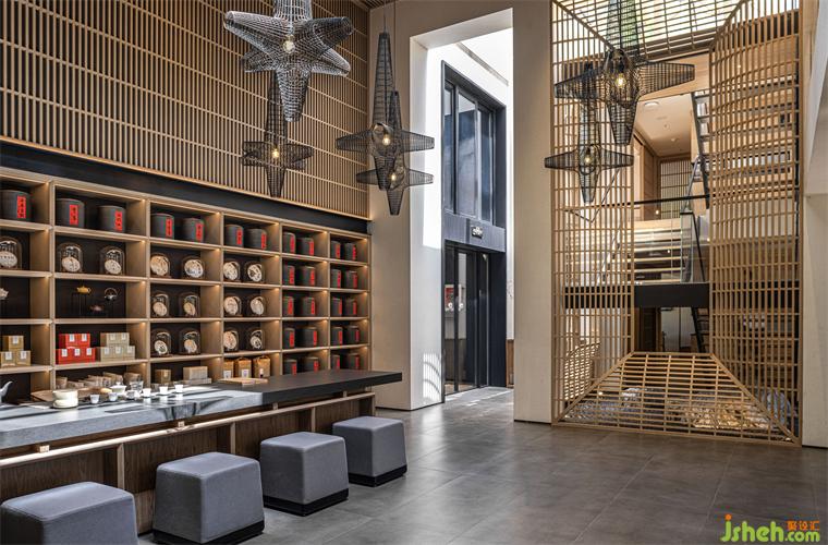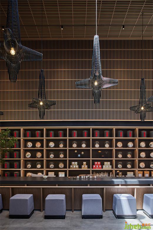 由此向內(nèi),不規(guī)則陣列的異形絲網(wǎng)燈由挑空的屋面垂下,細(xì)格柵由天花如瀑而下,作為條形茶臺(tái)的背景,筆觸簡(jiǎn)明有力。