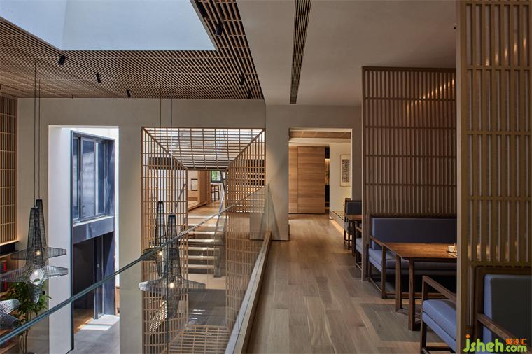 二層過(guò)渡空間以展陳為主,向內(nèi)設(shè)回廊卡座,樓板由原來(lái)的2.3米向挑空處推進(jìn)至3米,茶空間設(shè)計(jì)以獲得落座區(qū)更為松弛的尺度。