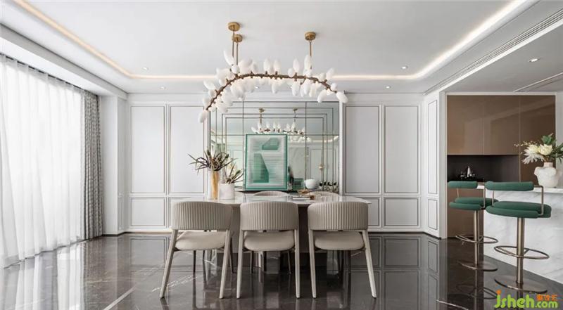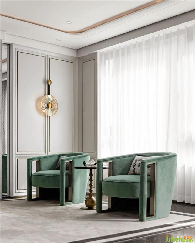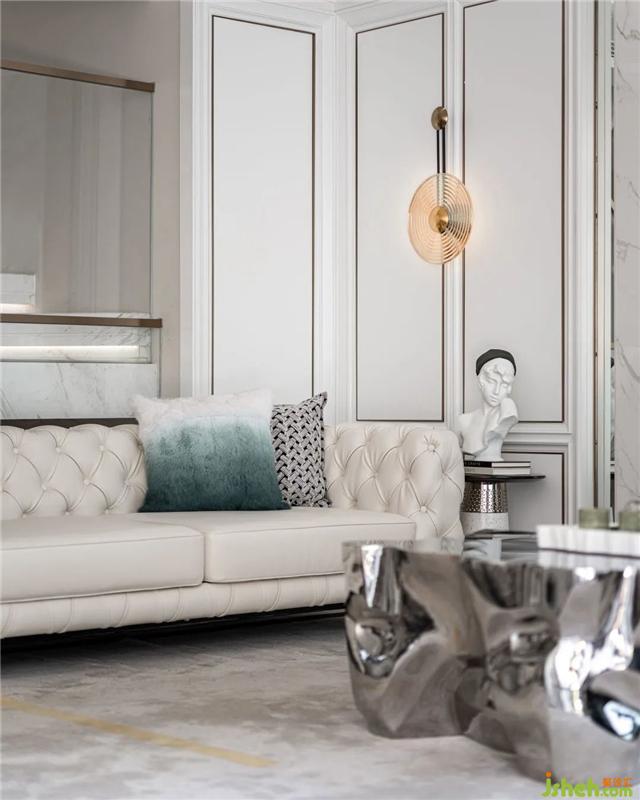設(shè)計的開篇,豐富的陳設(shè)與裝飾維系著空間優(yōu)雅的節(jié)奏。在白色大理石墻面的映襯下,柔軟的米色皮質(zhì)沙發(fā)、祖母綠色的絲絨座椅、形制不規(guī)則的當(dāng)代感銀色茶幾、精致華麗而又頗具趣味的藝術(shù)擺件,構(gòu)成了一幅摩登的美學(xué)畫面,其間的每一處褶皺、每一抹色彩、每一條紋路,樣板房設(shè)計均是對優(yōu)雅精神的無聲詮釋。