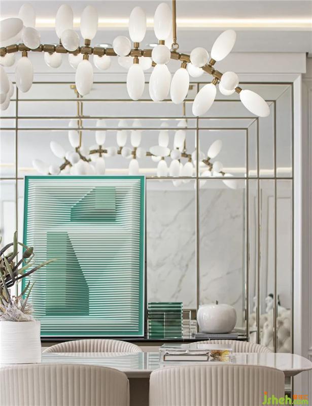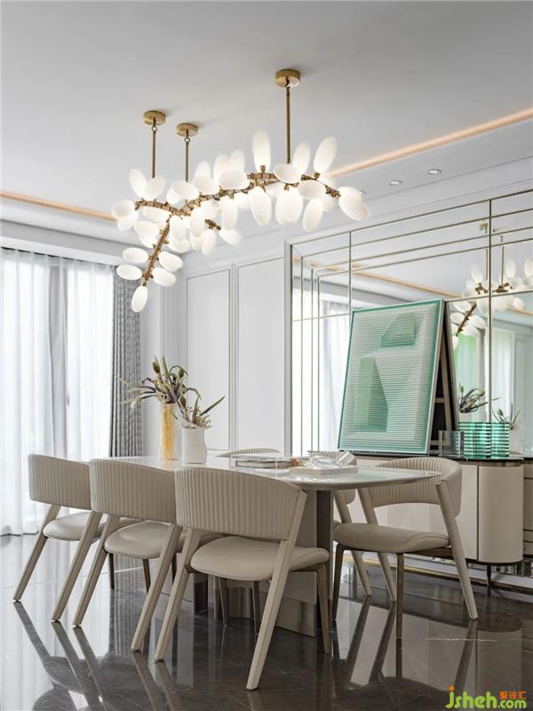 設(shè)計汲取Art Deco的經(jīng)典設(shè)計元素,幾何條紋版畫、黃銅花枝造型吊燈,加之花藝擺件的點綴,令餐廳空間在獨具質(zhì)感的美學(xué)視像中,洋溢著自然的清新與生命力。同時,鏡面反射將空間圖景無限延伸,擴(kuò)大了居者的視覺觀感與心境體驗。