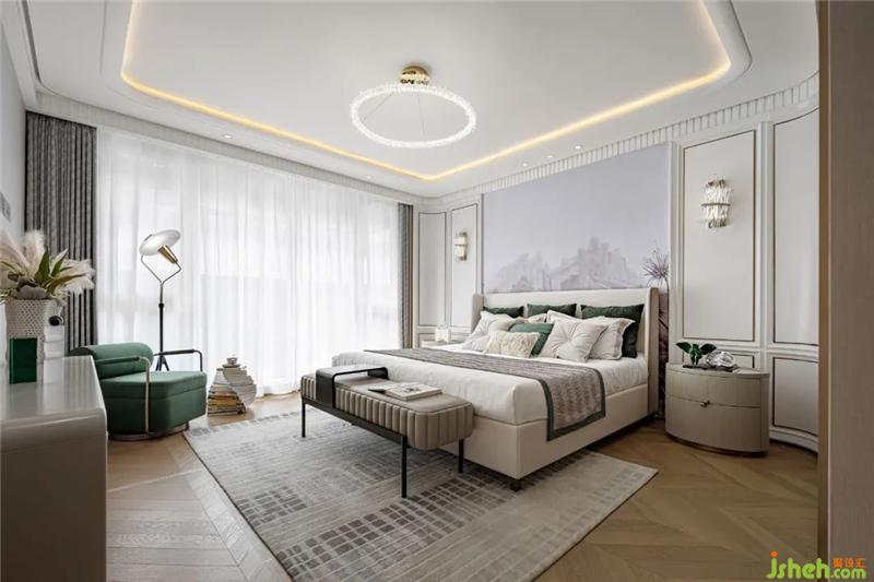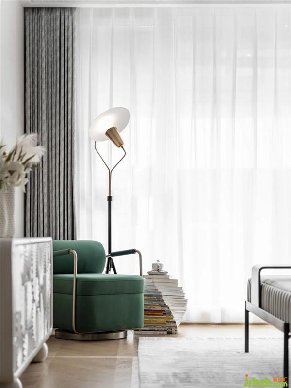 順著大理石臺階步入二層主臥,全明落地窗納入了通透的自然光線。米白、祖母綠、淺棕的色彩組合,及玻璃、金屬、布藝的材質(zhì)碰撞,使得空間更顯迷人的法式優(yōu)雅。單人墨綠扶手座椅搭配精致造型的落地?zé)簦瑯?gòu)成了一處休閑靜處的角落。在這里,居者可以隨意擇一本書,享受優(yōu)雅的午后時光。