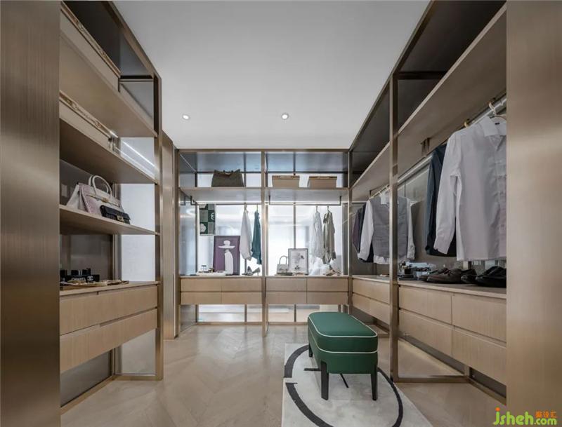 在開放式衣帽間,大面積柜體設置提升了空間的收納功能。在材質上,設計選用木質與金屬的融合,于細節(jié)處突顯精尚的工藝,以此呼應當代都市生活的儀式感。