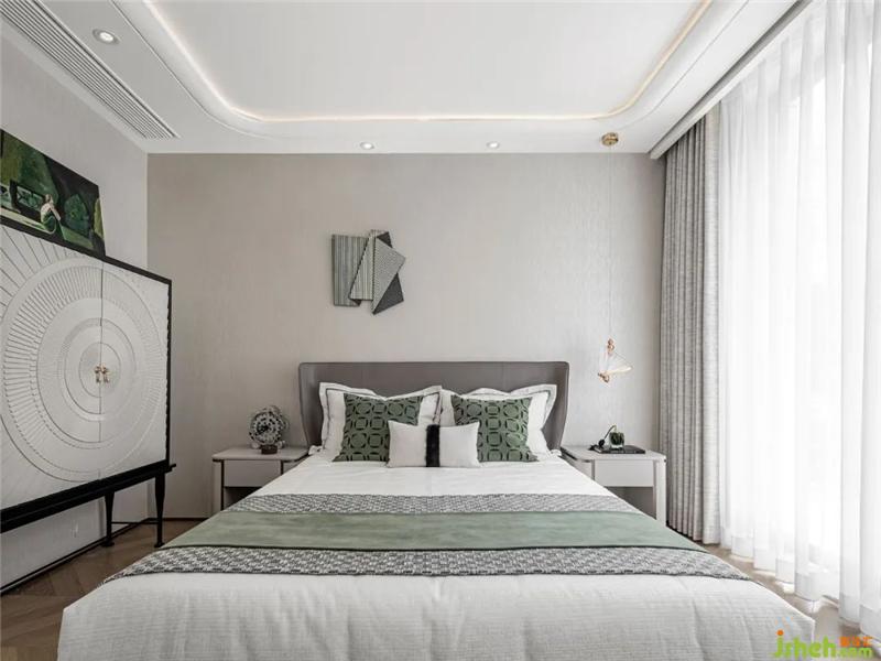 在深棕、淺灰、米白的淡雅色調中,設計選取不同層次的綠色點染于其間,堆疊出空間別樣的色彩層次。墻面的不規(guī)則線性裝置、邊柜的復古花紋、抱枕的幾何圖案,作為跳脫的藝術表達,于簡約中蘊藏著雅致的美學內涵。