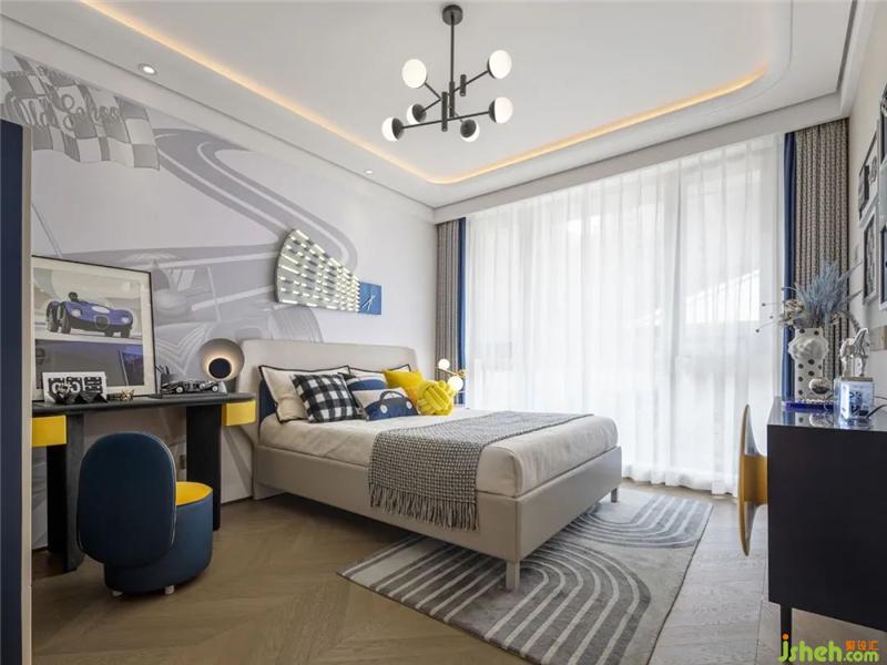 在此,設計師再次發(fā)揮色彩的妙筆,以深藍與明黃的點綴作為空間的主色調,令空間更顯活潑生動。同時,在場景氛圍的營造中,跑車及曲面元素的運用,賦予了空間嶄新的創(chuàng)意及玩味,亦彰顯出男孩潮酷的自由個性。