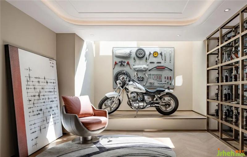 基于居者的個性喜好與審美主張,設計師在多功能娛樂室構建了一處自由隨性的場域。無論是炫酷的哈雷機車,還是陳列在酒架上的美酒,亦或是隨意放置于地面的抽象藝術板畫,皆透露著不凡的品味,彰顯出居者灑脫、個性、自信的生活態(tài)度。