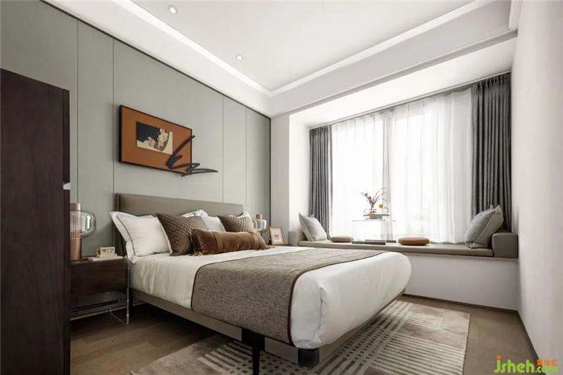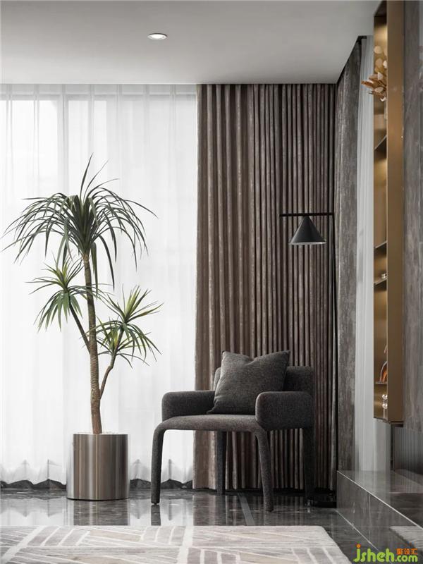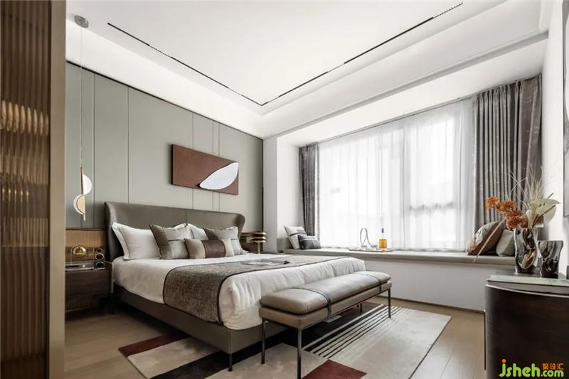 柔軟的床頭軟包、具有光澤感的絲絨、精致的木制角柜串聯(lián)起空間的雅奢氣質(zhì),亦以豐富的空間觸感,帶給居者踏實而溫暖的體驗感。