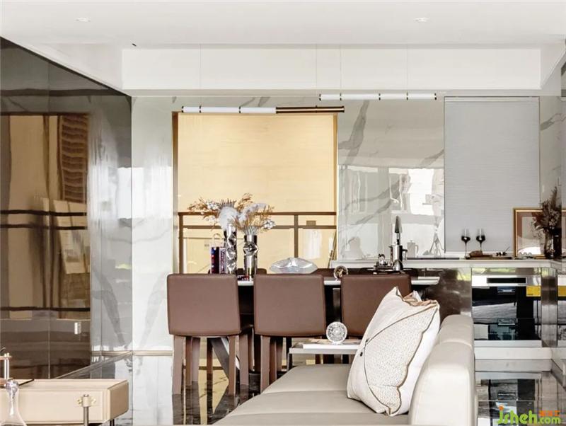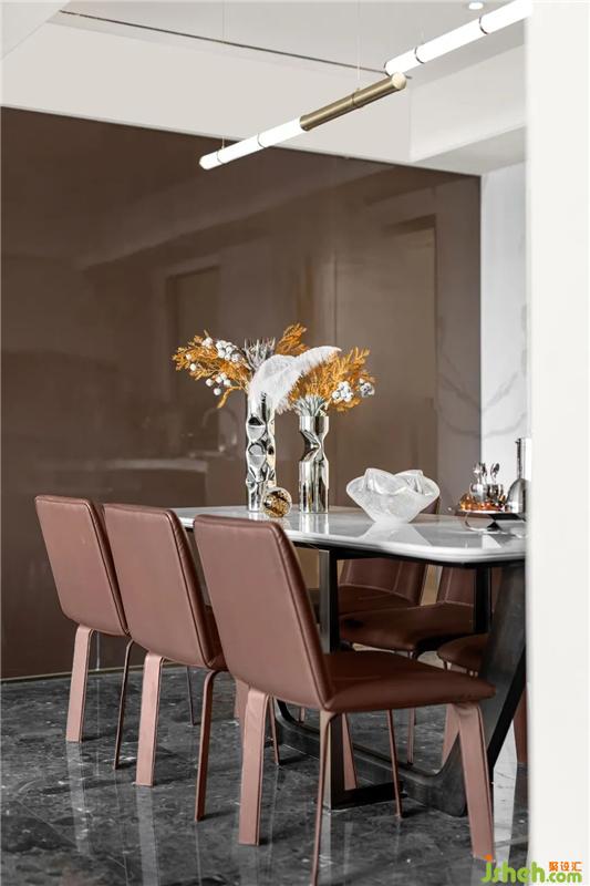 紅棕色皮革餐椅與纖細藝術(shù)吊燈的組合,在大理石地面的映襯下,譜寫著低調(diào)的奢華,透露出精致而時尚的就餐氛圍。