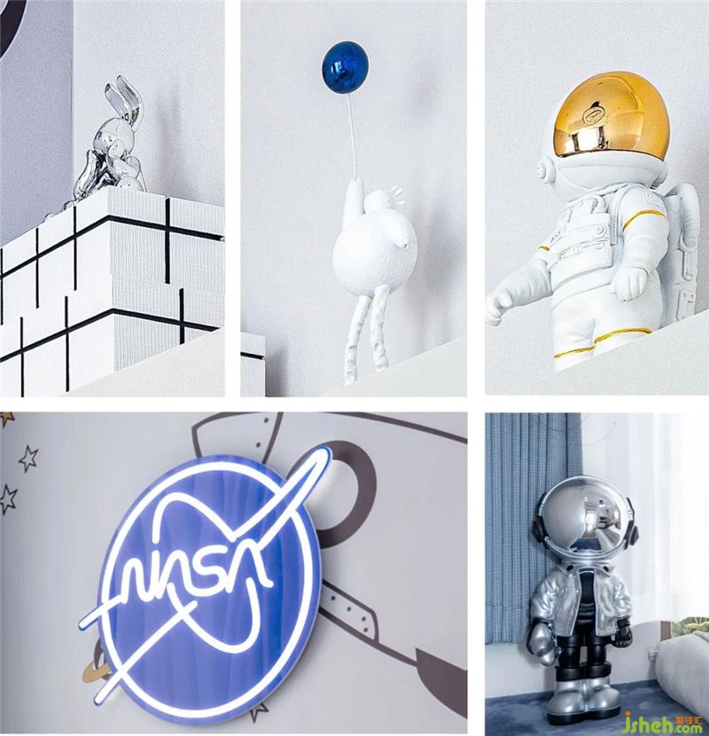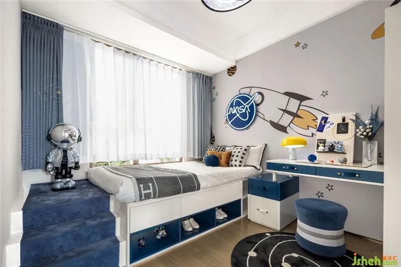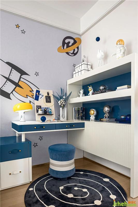 這里住著一個喜歡探索航空和宇宙的可愛男孩。其中藍色的鋪墊讓空間充滿著青春與活力,而極富創(chuàng)造力的墻繪與航空員擺件則象征著男孩獨特的喜好與個性,這一充滿童趣的氛圍賦予了孩童充足的想象空間與創(chuàng)造力。