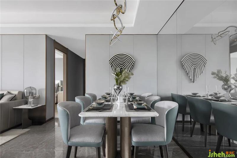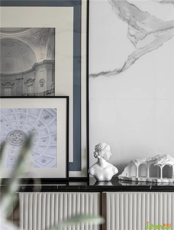幾何線條造型、古典人物雕塑擺件、硬朗的金屬輪廓、歐式建筑版畫......一系列經(jīng)典的Art Deco元素,經(jīng)由當(dāng)代理性的設(shè)計(jì)秩序與和諧統(tǒng)一的色彩表達(dá),演繹為空間靈動(dòng)的美學(xué)注腳,彰顯著居者個(gè)性的生活態(tài)度與審美品味。
