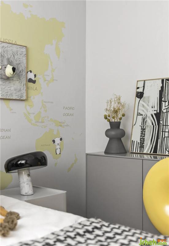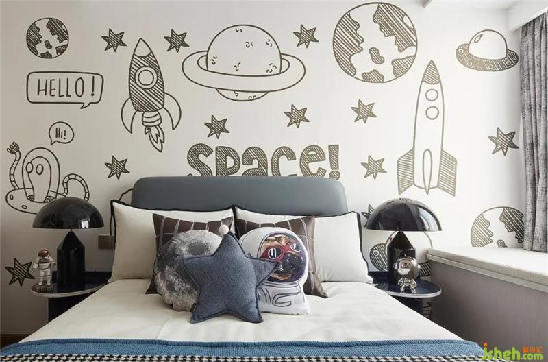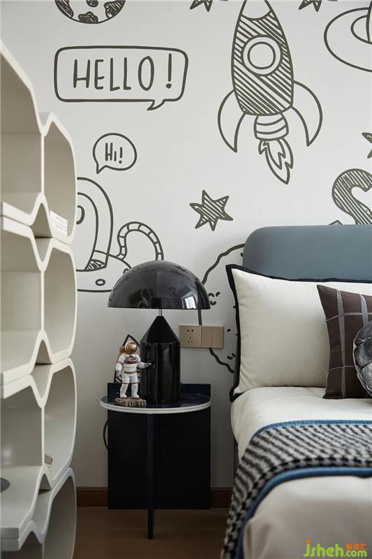 男孩房的設(shè)計(jì)童趣十足,在具有未來感的太空主題中,天文望遠(yuǎn)鏡、航天員擺件、星系抱枕串聯(lián)起精彩的故事情節(jié),一個(gè)夢幻宇宙世界就此展開上海裝修室內(nèi)設(shè)計(jì)。