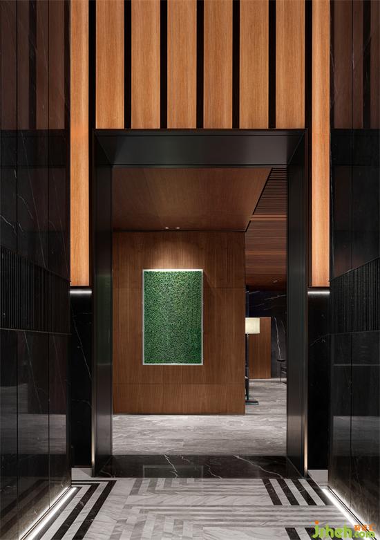 黑白線條交錯(cuò)的地磚,交替組合的圓形與方形元素,既延續(xù)并重構(gòu)了寶格麗的經(jīng)典圖案,也為大堂整體深色的空間里增添了活躍的層次感,以寶格麗低調(diào)、質(zhì)感的設(shè)計(jì)之形建構(gòu)尊貴、舒朗的內(nèi)在體驗(yàn)及售樓處設(shè)計(jì)感受。