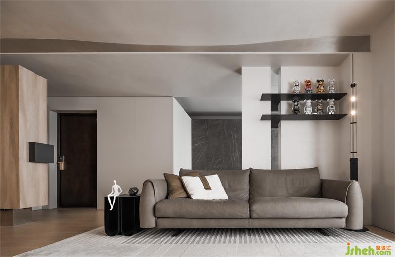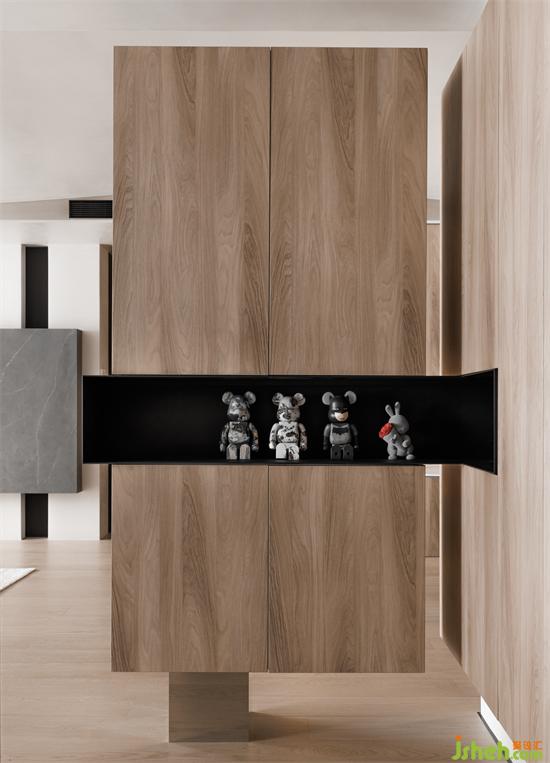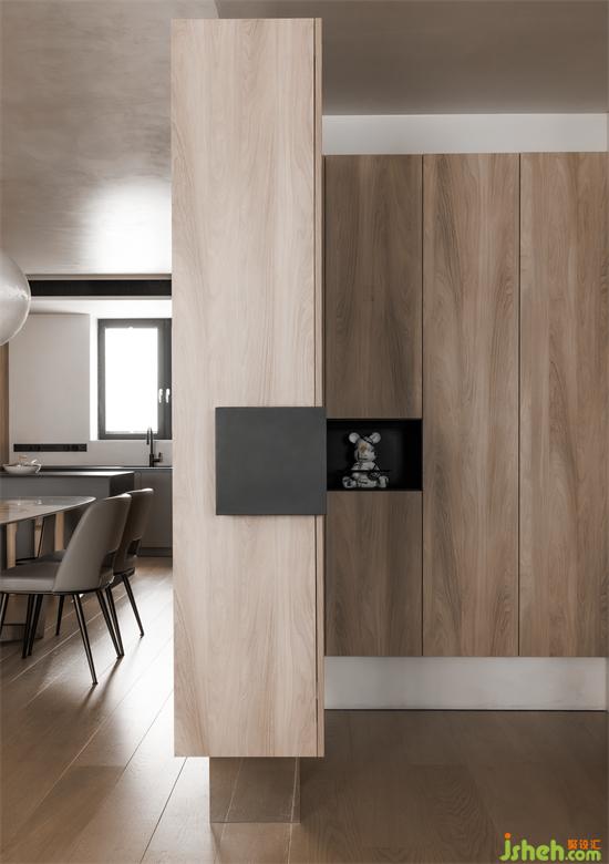 客廳與書(shū)房的隔墻中間留有一條縫隙,上設(shè)鋼板連接至?xí)?,讓兩個(gè)空間有了互動(dòng),鋼板上也能放一些業(yè)主收藏的潮玩手辦,一舉兩得。