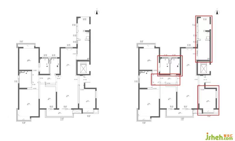 原始房型是一個(gè)四居室的戶型,由于四人居住,只需保留三間臥室,結(jié)合采光與朝向,南側(cè)次臥不保留,根據(jù)業(yè)主需求重新做規(guī)劃。家裝設(shè)計(jì)原始北面臥室套內(nèi)衛(wèi)生間與公共區(qū)域衛(wèi)生間面積都過(guò)小,不便于平時(shí)起居使用。原始過(guò)道區(qū)域也過(guò)于狹小,整體動(dòng)線不舒適。原始廚房區(qū)域比較雞肋,餐廳區(qū)域又太狹長(zhǎng),需重新做布局調(diào)整。