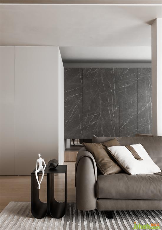 玄關(guān) L 型鞋柜底部鏤空,用鏡面柱體支撐,形成視覺(jué)懸浮。中間用黑色不銹鋼橫板連接兩個(gè)面,可以進(jìn)門(mén)隨手放一些隨身物品。家裝設(shè)計(jì)兩面柜體中間留有一條縫隙,若隱若現(xiàn)的人物動(dòng)態(tài)從中透出,給玄關(guān)注入了動(dòng)態(tài)活力,避免入戶一望到底的同時(shí)也使空間有互動(dòng)性。