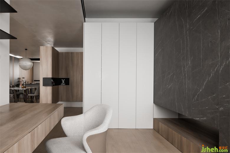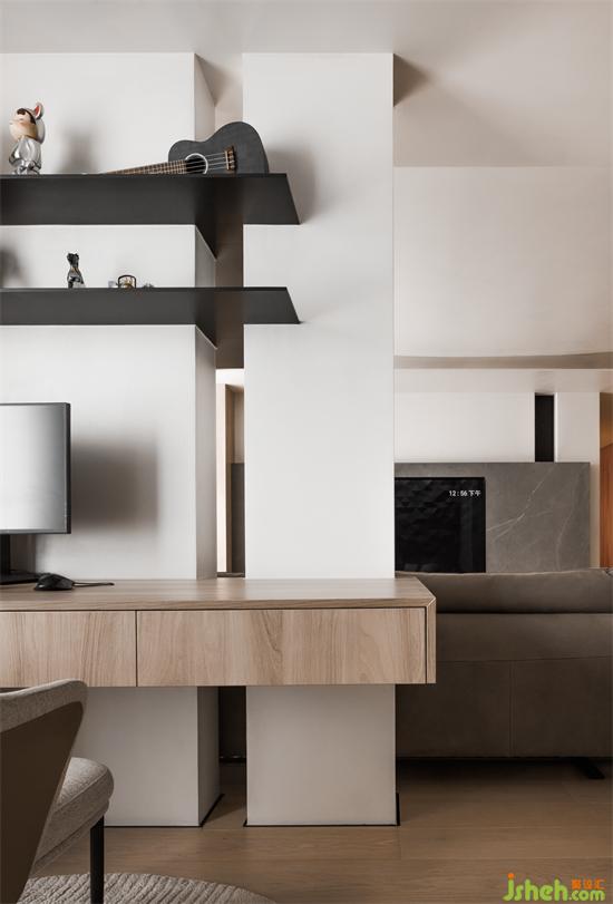 書房墻體打開后,做懸浮桌面與立面墻體呼應(yīng),形成橫豎結(jié)構(gòu)關(guān)系。L 型收納柜,側(cè)面做白色封閉式,避免全部使用同一材質(zhì)形成視覺疲勞,也能與頂面白色形成一體。家裝設(shè)計(jì)后側(cè)大理石門板、鏡面、木質(zhì)地臺(tái),三種不同材質(zhì)與整屋色調(diào)形成一致,在空間上形成聯(lián)動(dòng)效應(yīng),整個(gè)公共空間整體性更強(qiáng)。