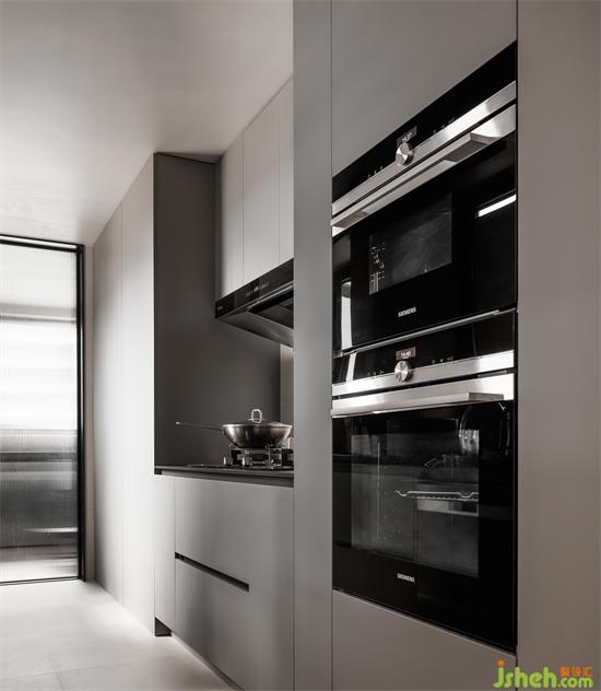廚房隱藏式移門收納在柜體中,在用中廚烹飪有油食物時(shí)拉上就能阻隔油煙互竄,平時(shí)不用的時(shí)候打開就能讓空間通透,不占用空間。灶臺(tái)下方櫥柜一部分不做落地,方便烹飪時(shí)站腳,一些小細(xì)節(jié)就能為整個(gè)家融入細(xì)膩。