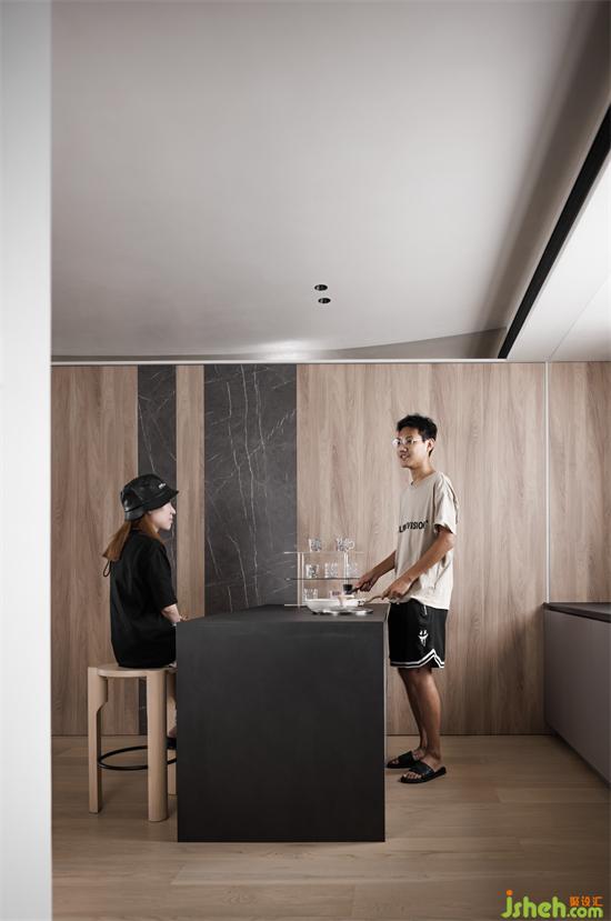 細(xì)膩的大理石紋理搭配上簡(jiǎn)雅的木質(zhì)飾面,使整體空間大氣而干練。家裝設(shè)計(jì)黑色巖板吧臺(tái),上面內(nèi)設(shè)隱藏式電磁爐,不影響美觀的同時(shí)又能增加功能性。