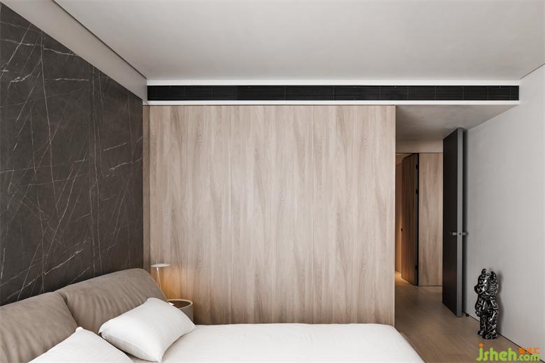 延續(xù)公共空間,主臥同樣使用了大理石和木飾面,床背景墻用鏡面去連接兩面材質(zhì),家裝設(shè)計(jì)形成過渡,也能延伸視覺感受。