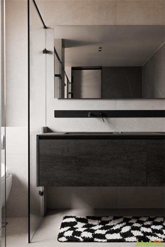 私人定制的浴缸內(nèi)嵌燈帶,灰色墻磚中和了龍頭的黑色與浴缸的白色,泡澡也有了儀式感。