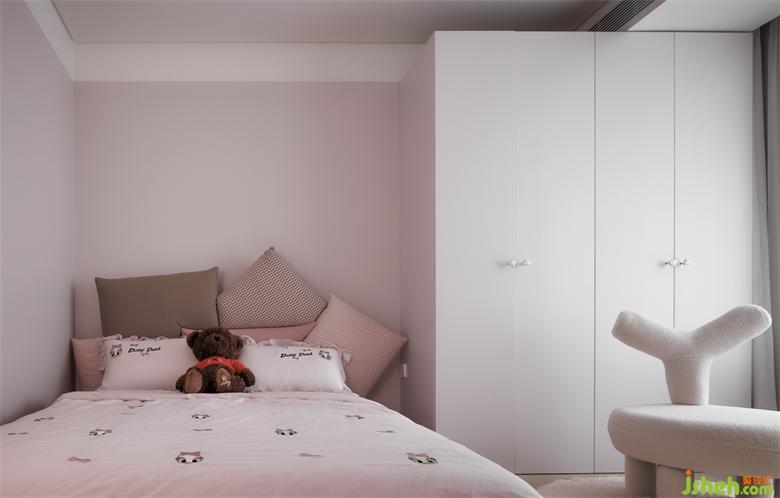 女兒房用粉色裝飾,粉色的 Kaws 擺件、Olga Engel 的圈圈絨單人椅,都能體現(xiàn)女兒的軟糯和童真。家裝設計床背景墻面粉色與衣柜齊平,和頂面形成自然開脫,增加空間層次。